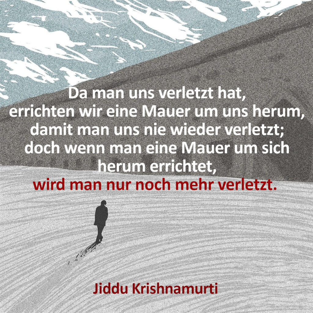 Hinderungsgrund Nummer 1 ist nur leider, dass gerade so geprägte Menschen, wie auch Krishnamurti es vollkommen richtig beschreibt, einen Schutzwall um sich herum bauen, um ja keine Verletzungen mehr zu erleiden, was jedoch gleichzeitig verhindert, dass das Gute, dass die Liebe Einlass erhält. Denn, hier bin ich wiederum ganz bei Tagore „Das Geschenk der Liebe kann man nicht geben. Es wartet darauf, angenommen zu werden.“